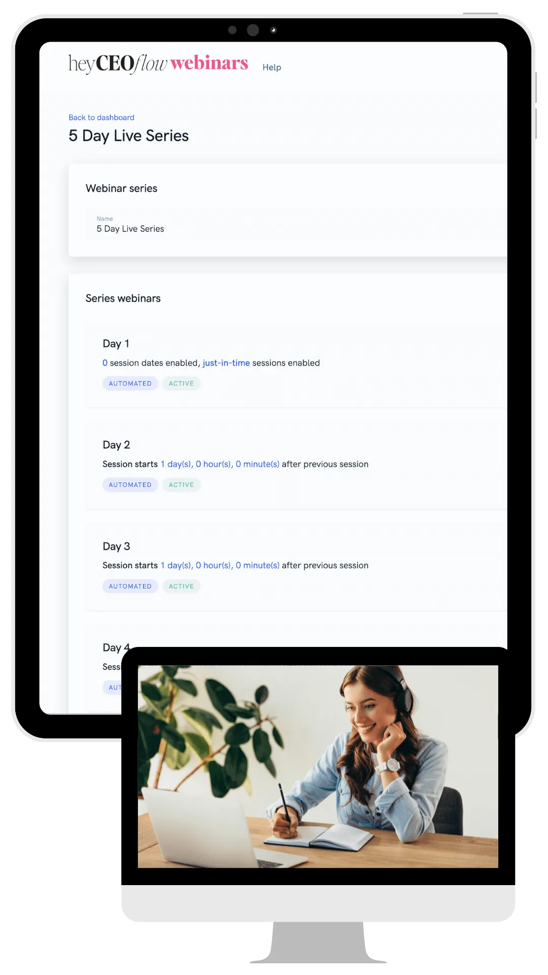 With heyCEOflow Webinars, you can easily schedule multi-day webinar series like a 5-day challenge or any other virtual event your heart desires. Your attendees will be counting down the days until your next session!
