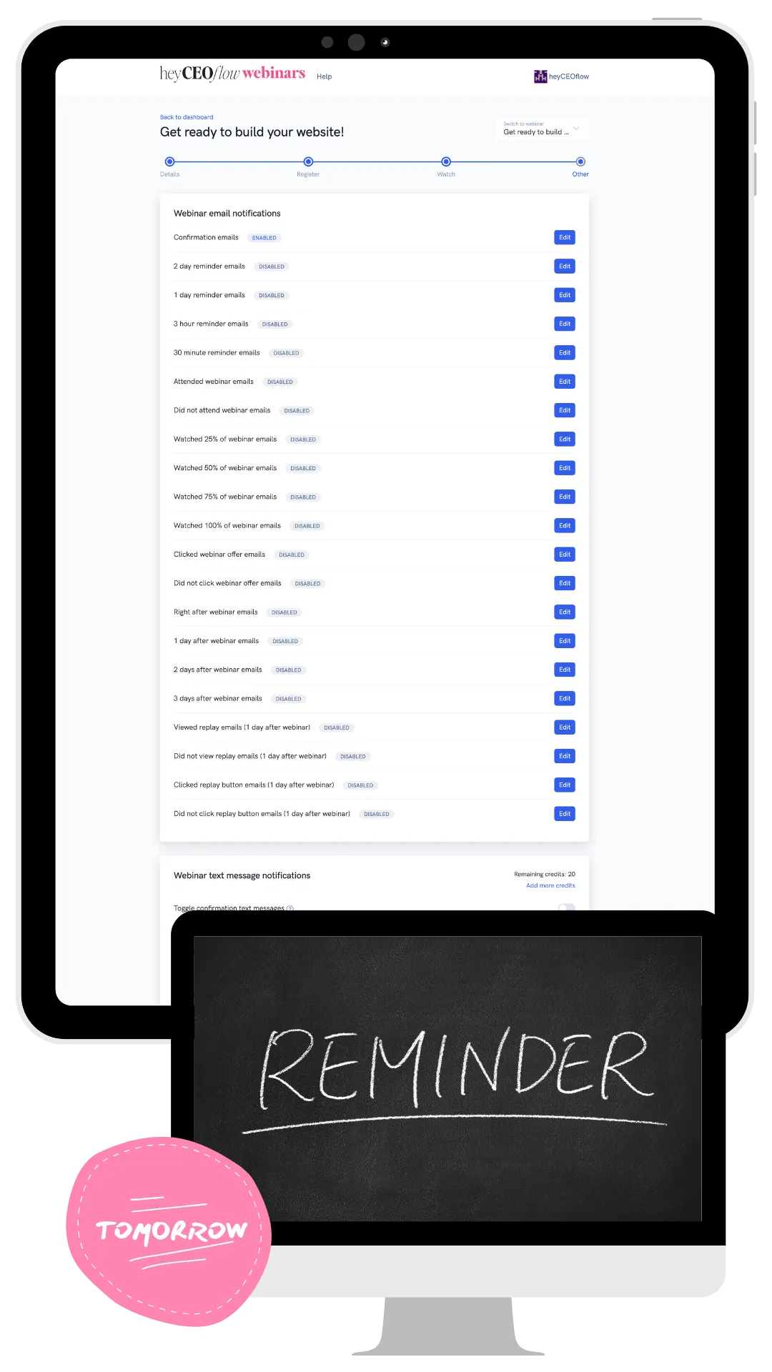 Never let a lead slip through the cracks again. heyCEOflow Webinars' powerful omnichannel notifications make it easy to increase event registration and show-up rates. From automated email reminders to SMS notifications and everything in between, you'll have your attendees marked "hell yes" on their calendars.